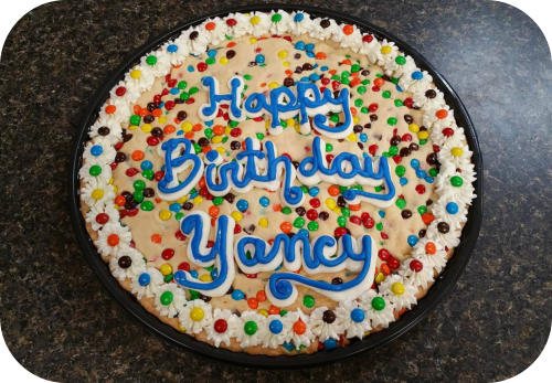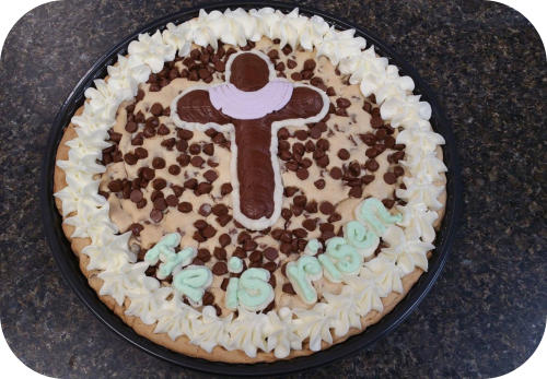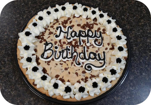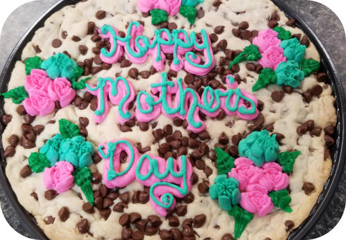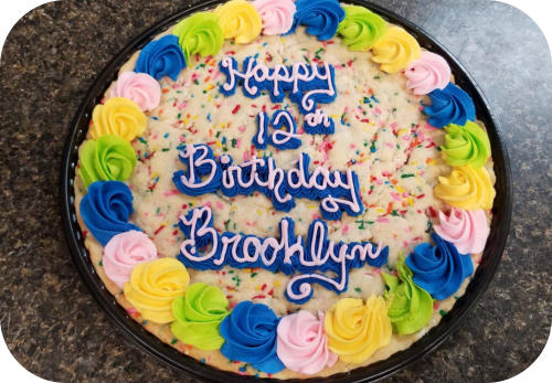 We now offer 12” Round Cookie Cakes for your enjoyment. We bake fresh using our own cookie recipe available in Chocolate Chip, M&M, Funfetti, Sugar, Lemon Glazed, Reese’s Pieces, and Glazed Strawberry… we can customize your cake with your colors and message. We have a limited amount of ones available daily but you can pre-order your own 48hrs in advance.